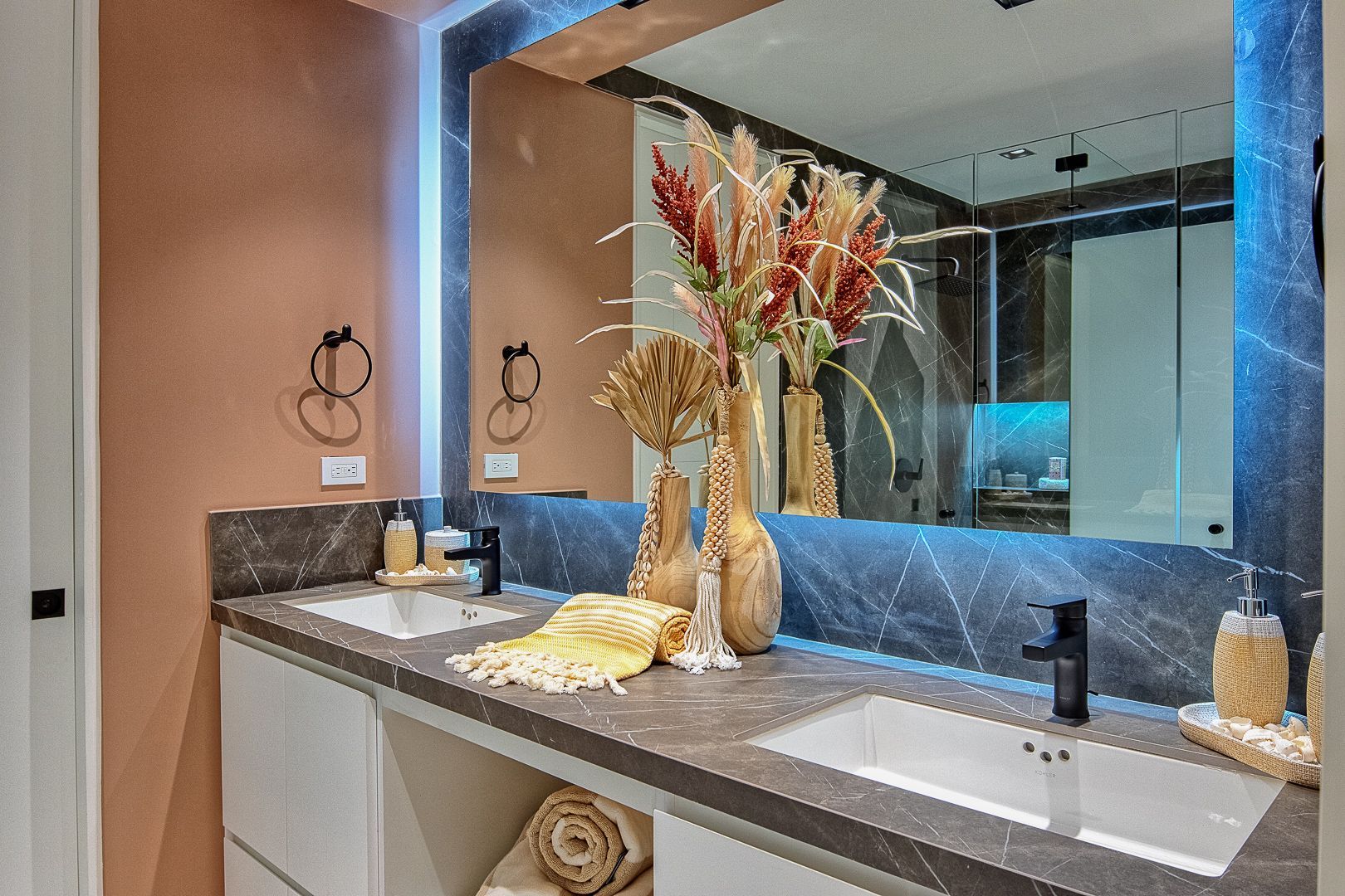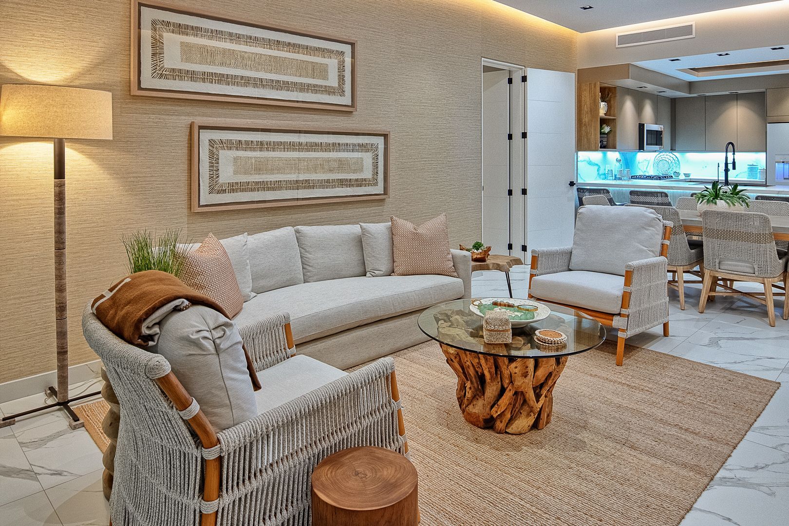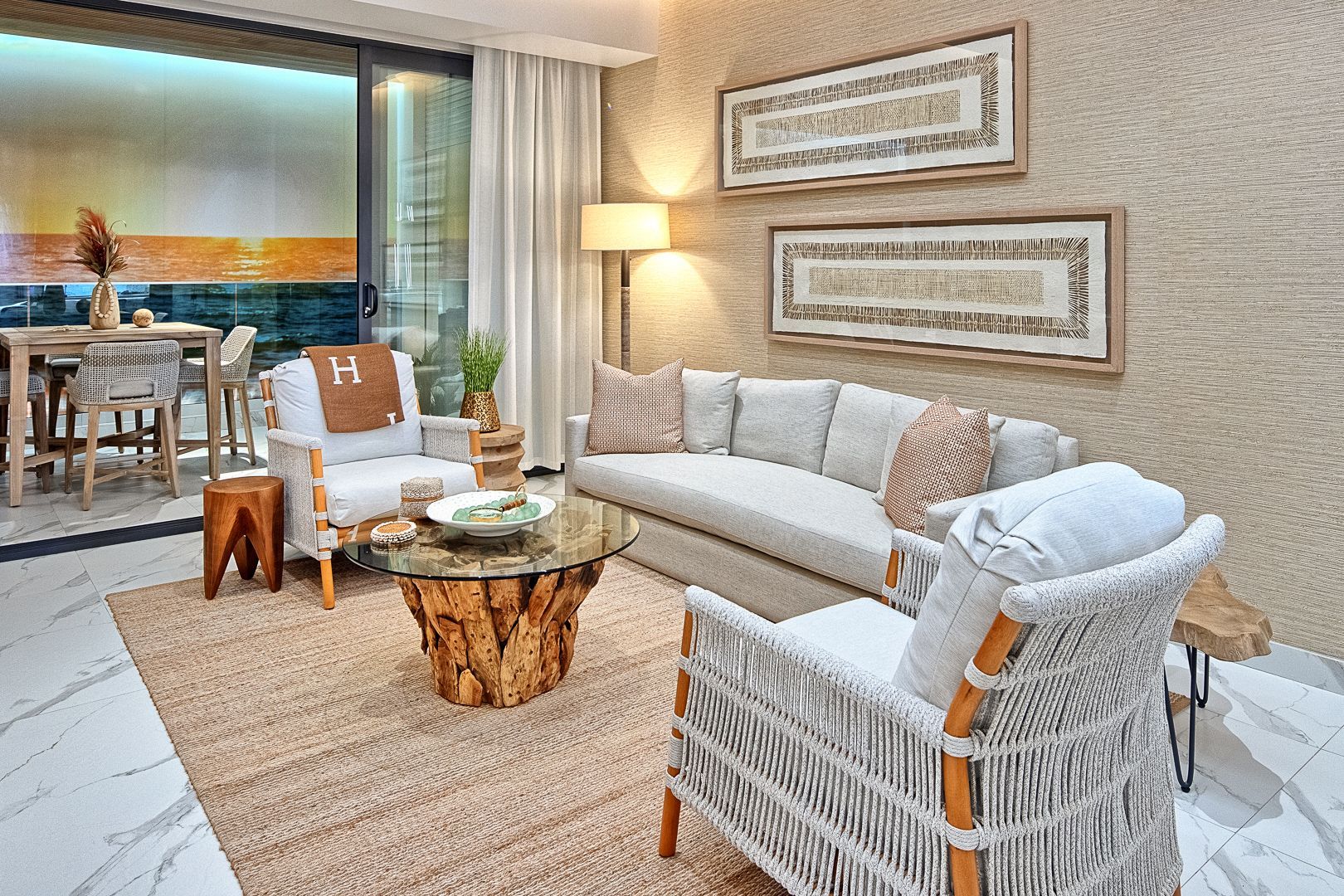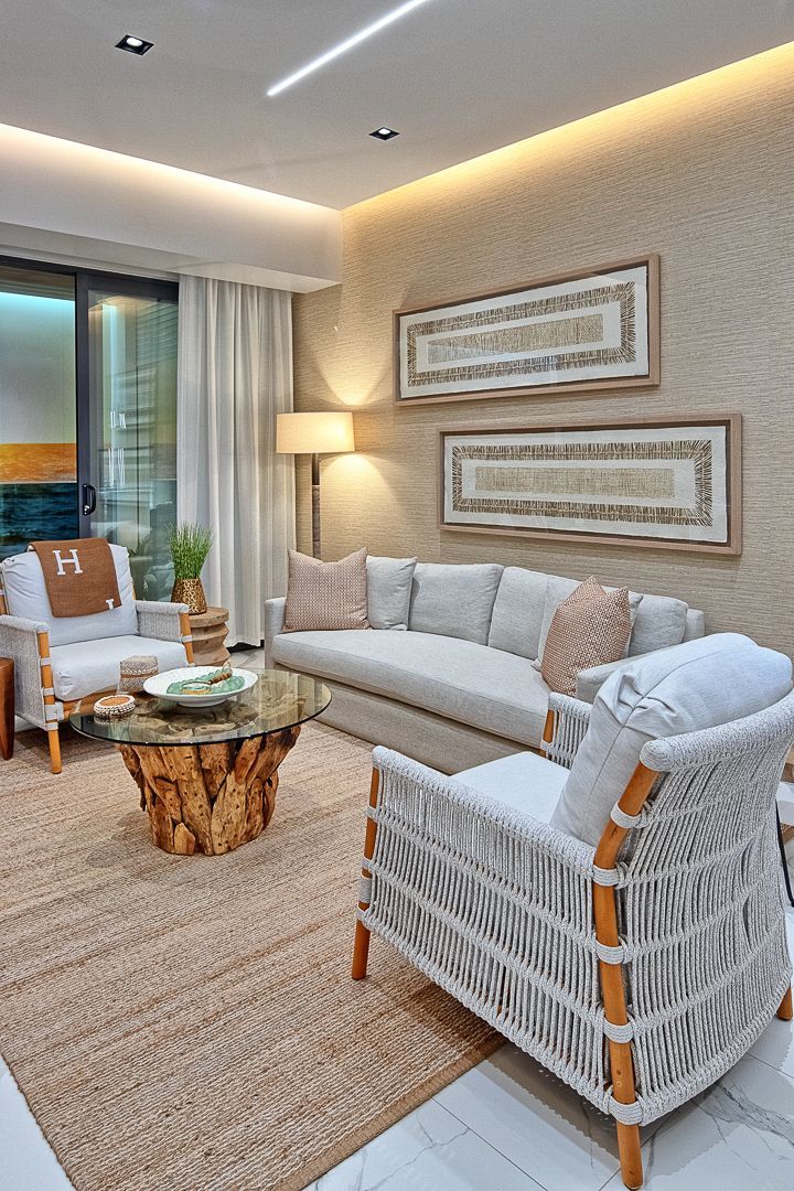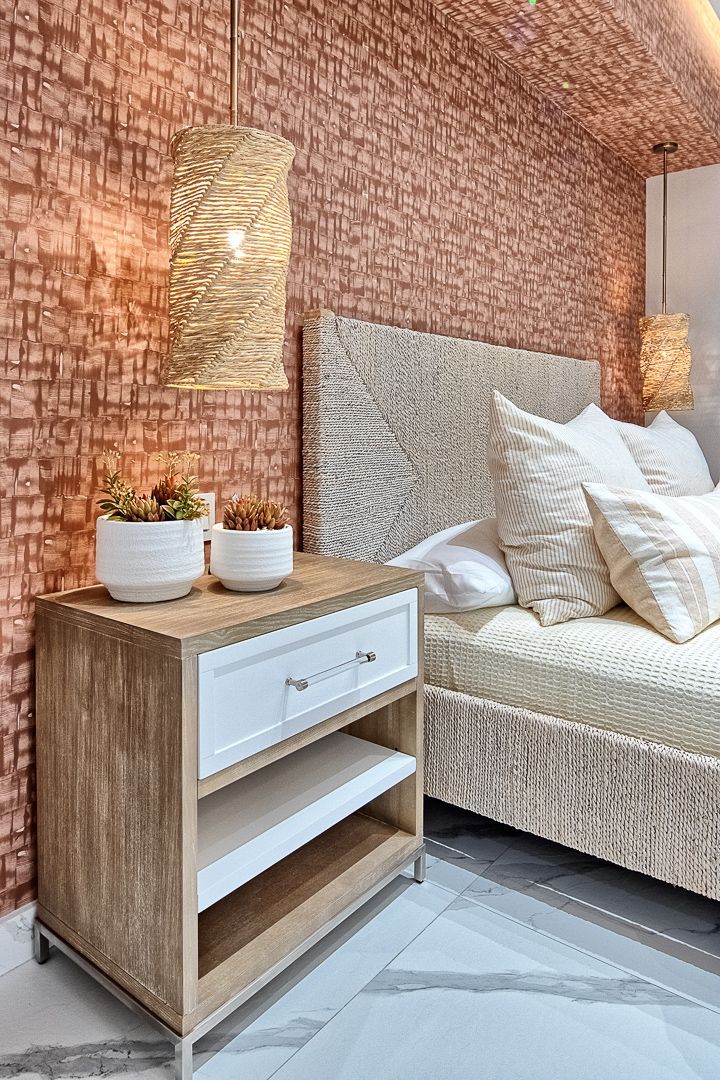 A refreshing color scheme of soft neutrals—blended grays, warm terracotta's play well with natural textures and woven materials creating an organic seaside inspiration.
