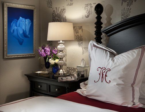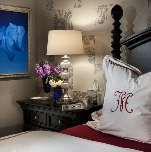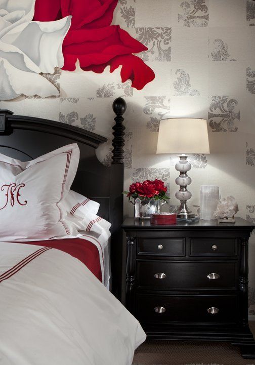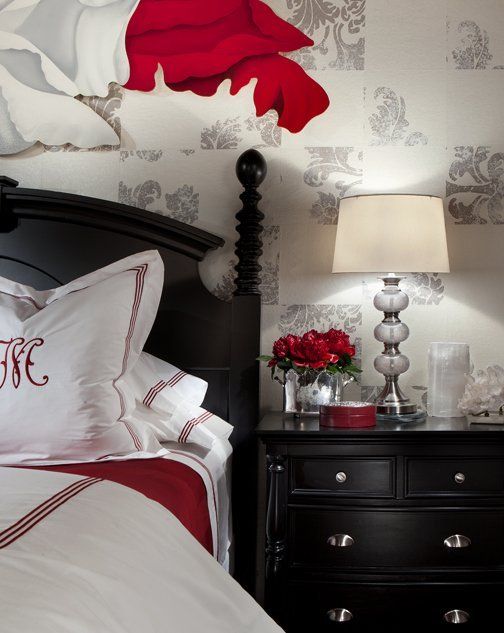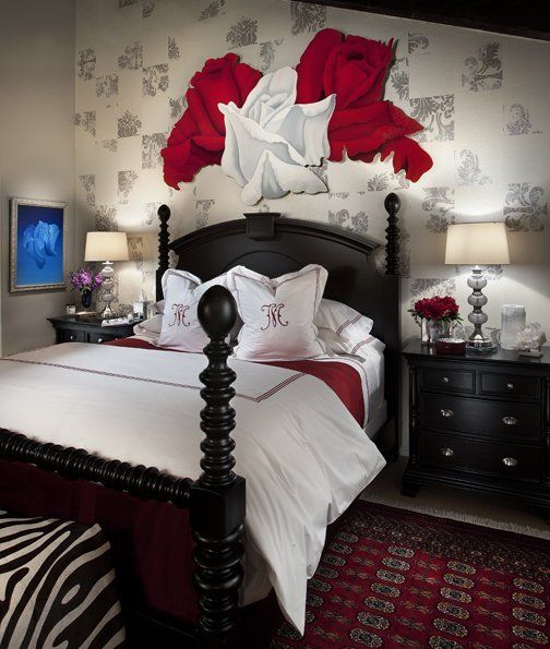 Dramatic Artwork is the focal point of this dramatic bedroom.